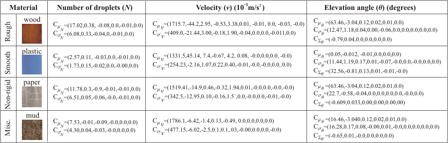 The coefficients of the splash models of four materials. The splash