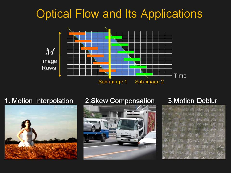 The optical flow can be used for motion interpolation, skew compensation, and motion deblur. Please