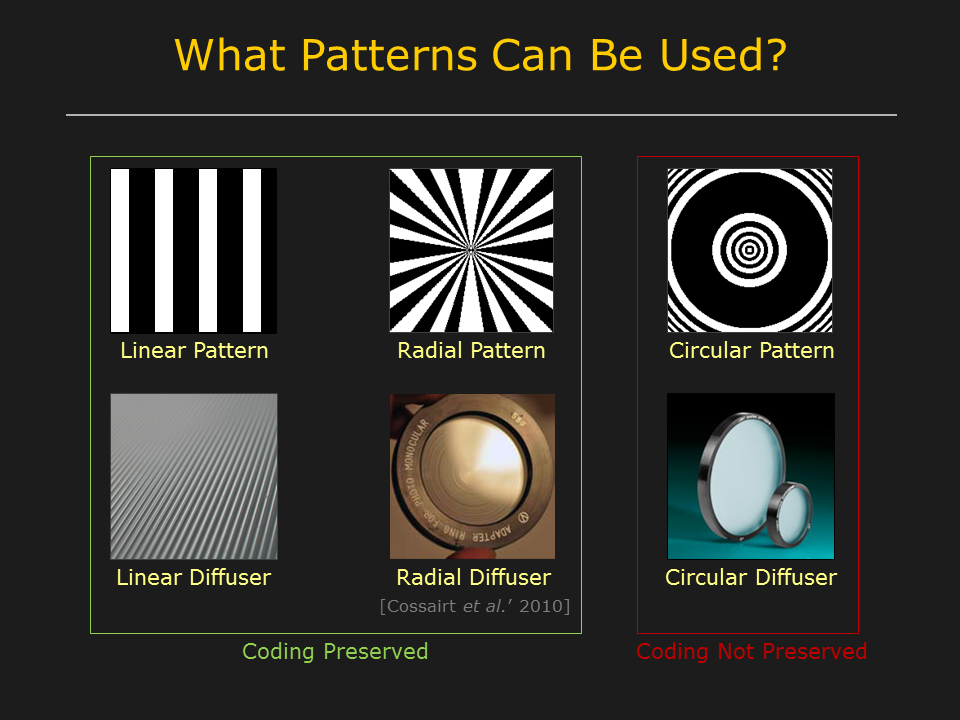 Our technique is applicable if the projected patterns have linear iso-intensity contours. For example, patterns with linear translational symmetry can be used with linear diffusers and patterns with radial symmetry can be used with radial diffusers. In these cases, the illumination coding is preserved. Diffuse SL can not be used if the patterns have non-linear iso-intensity contours. For example, if circular patterns are used with a circular diffuser, coding information will not be preserved.