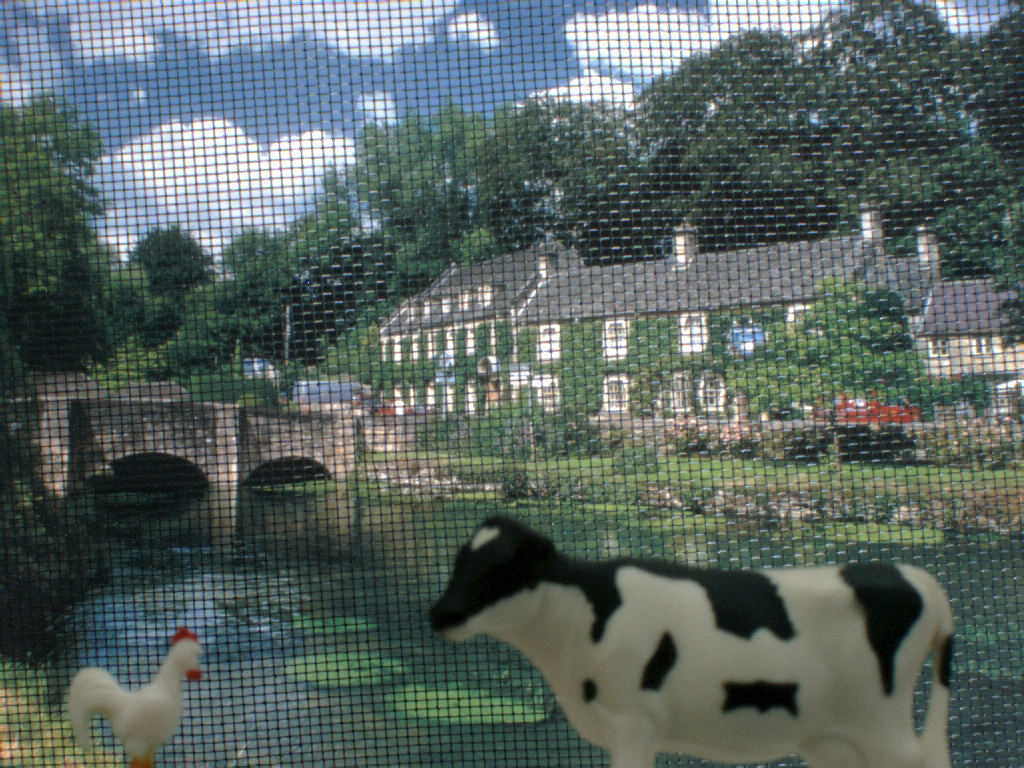 | In this scene we have a toy cow and a toy hen in front of a wire mesh, behind which there is a scenic background. We can capture this scene so that we see the toys and the background, but the wire mesh is so defocused that it vanishes from the image. |
