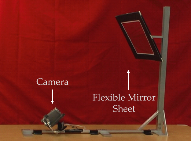 scene reflected in a flexible mirror sheet. By deforming the mirror we can