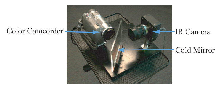 To capture tagged photos, the user camera must be able to acquire a color photo and an IR video, simultaneously. As a proof-of concept, we have constructed a hybrid camera for this purpose. This camera consists of a consumer camcorder and an IR camera. |