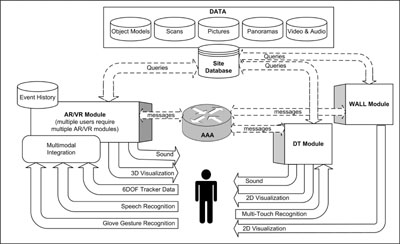 In our system, multiple users, wearing tracked, head-worn, see-through displays, can interact with the environment using tracked, instrumented gloves, a multi-user, multi-touch, projected table surface, large wall displays, and tracked hand-held displays. We take advantage of our ongoing work on 3D multimodal interaction to allow users to combine speech with head, hand, and arm gestures to aid them in their tasks. Although the dig site can be visualized as a purely virtual environment, when users collaborate using the projected table, their see-through head-worn displays allow them to see personalized overlaid material in context with the shared, projected table surface.