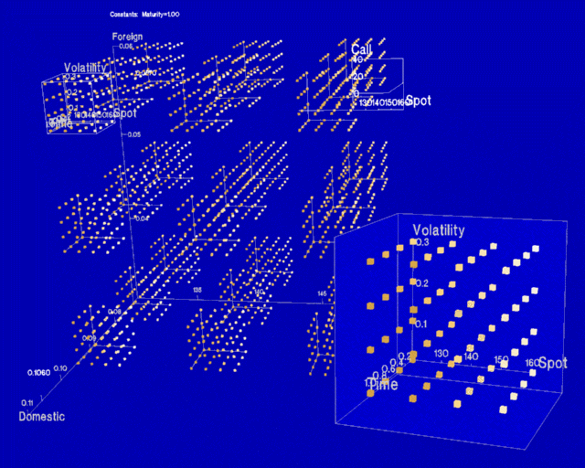 Figure 5. Visualization generated for exploring a call option. AutoVisual chose the point cloud interactor because it encodes many variables. The hierarchy is populated with point clouds so that the visualization presents a summary of the function, with little or no interaction required by the user. The zoom tool can be used to examine the point clouds. The line graph tool redisplays a portion of a point cloud using a superior encoding technique. |