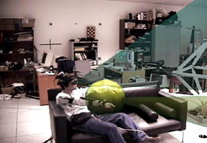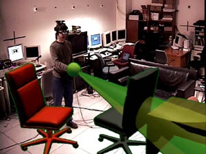 To demonstrate the use of SenseShapes we have designed a multimodal interface that uses glove-based gesture recognition (Essential Reality P5 glove) and speech recognition (IBM ViaVoice 10) for a simple task of redecorating our lab (coloring, moving, rotating and scaling objects). Our glove-based gesture recognizer currently supports only 3 gestures (point, grab, and thumbs-up), but we have found those to be sufficient for our purposes.