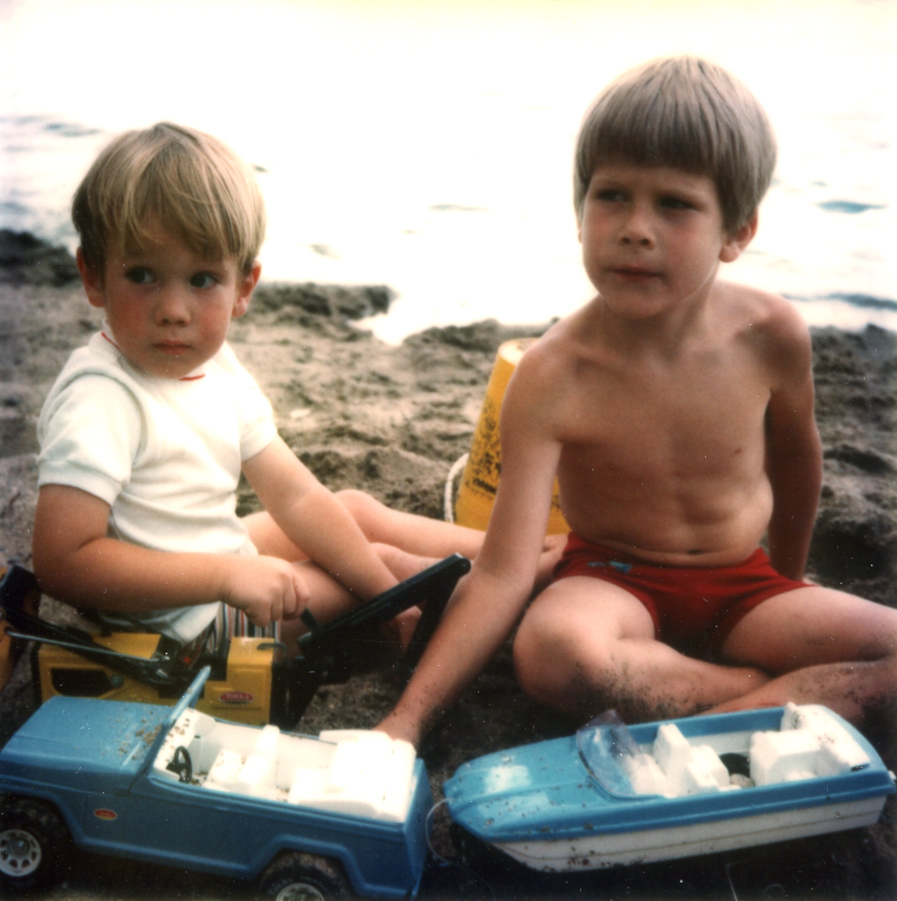 19760725 Ryan and Stephen with Birthday presents at Lake Harriet, MN