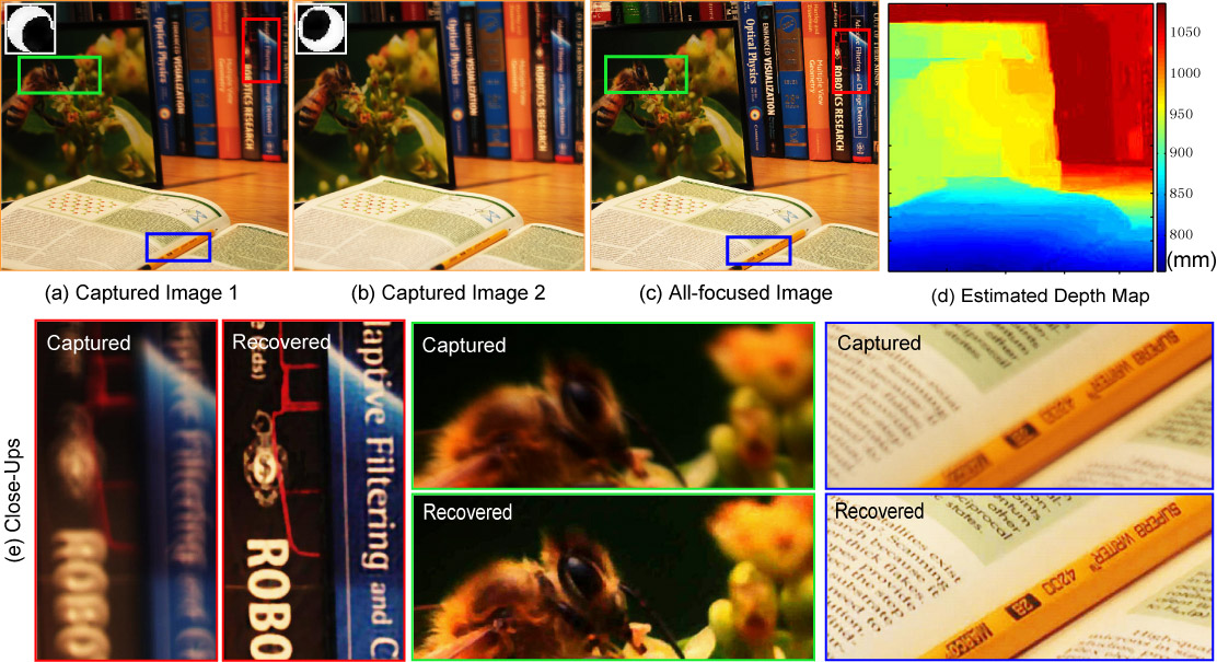 Abstract: The classical approach to depth from defocus uses two images taken with circular apertures of different sizes. We show in this paper that the use of a circular aperture severely restricts the accuracy of depth from defocus. We derive a criterion for evaluating a pair of apertures with respect to the precision of depth recovery. This criterion is optimized using a genetic algorithm and gradient descent search to arrive at a pair of high resolution apertures. The two coded apertures are found to complement each other in the scene frequencies they preserve. This property enables them to not only recover depth with greater fidelity but also obtain a high quality all-focused image from the two captured images. Extensive simulations as well as experiments on a variety of scenes demonstrate the benefits of using the coded apertures over conventional circular apertures. |