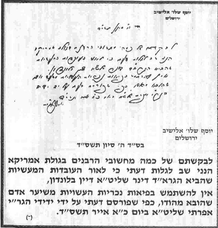 This is Rav Elyashiv's response to Rav Belsky (see below for Rav Belsky's letter)