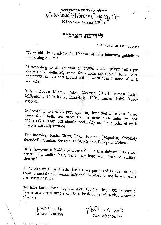 This is the announcement in Bnei Brak by Rav Karelitz and Rav Wosner about the sheitel situation.