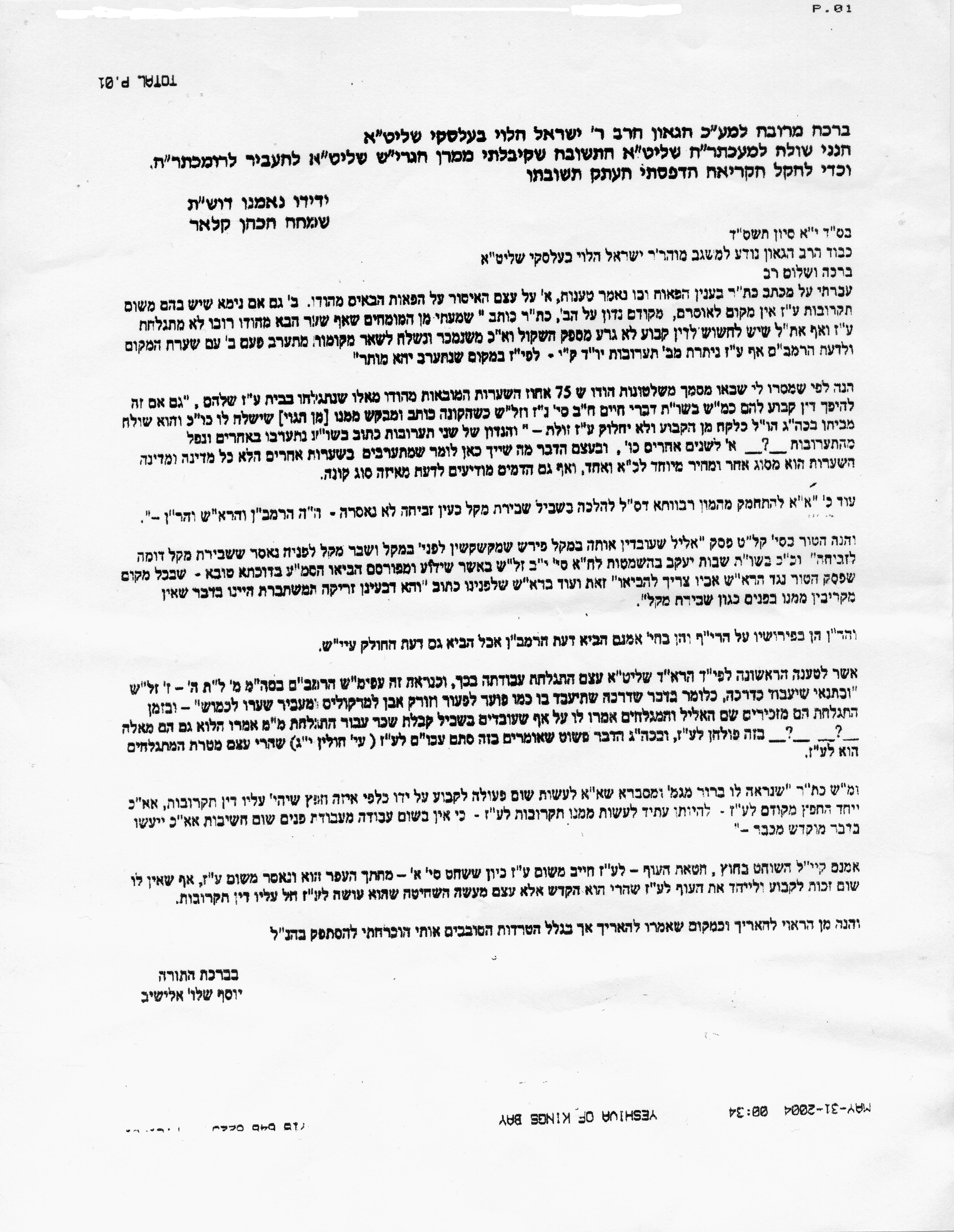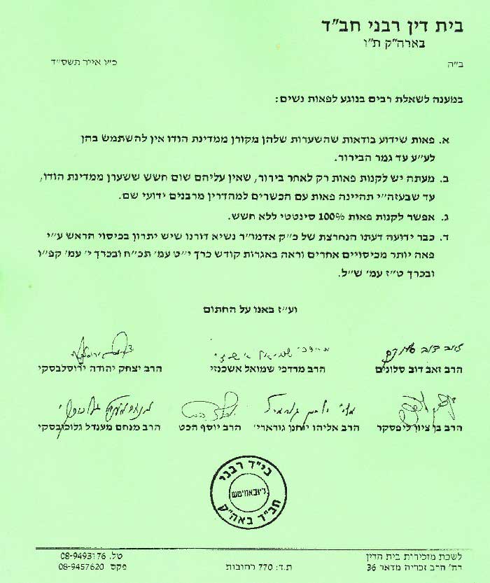 This is the teshuva of Rabbi Yisroel Yosef Hendel, Rabbi of the Chabad community in Migdal Haemek