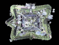 | Left: An aerial photograph of Fort Jay, courtesy of the National Park Service. Right: A view of our resulting 3-D model of For Jay. | |