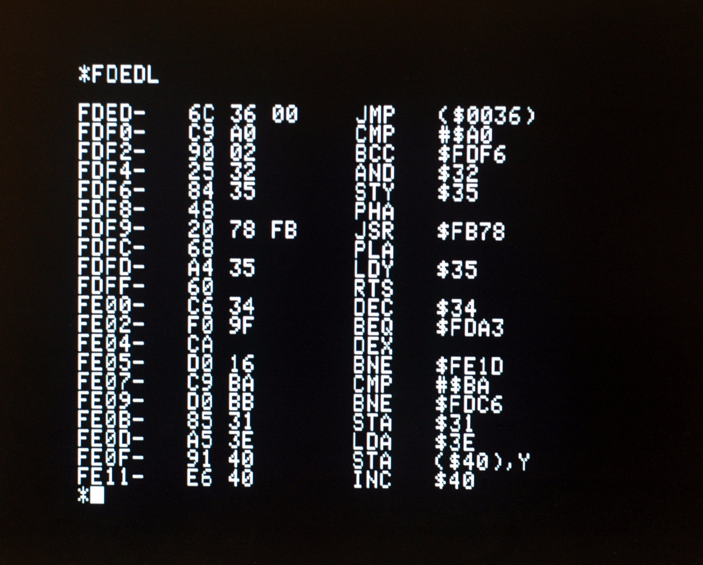 For debugging, I brought out the CPU's PC to four of the seven-segment displays on the board and the current track for the drive on another two. While the PC is usually changing so fast it becomes a blur, patterns do often emerge. For example, the PC remains highly focused when the computer is waiting at the prompt. Similarly, I have found a lot of software, including the operating system when it is moving the drive head, calls the monitor's "delay" routine to slow things down.