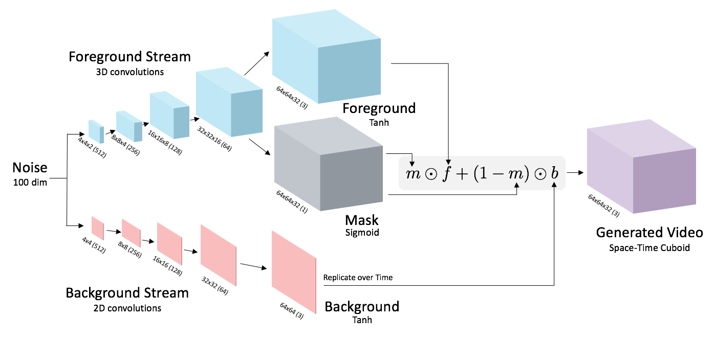 low-dimensional random noise and outputs a video. To model video, we use spatiotemporal up-convolutions (2D for space, 1D for time).